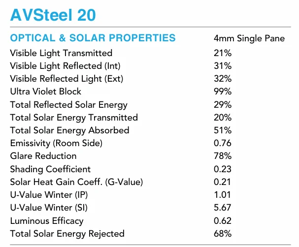Steel 20 is a strong-performing solar film that offers excellent heat rejection, glare reduction, UV protection, while also giving the glass a clean and modern finish.